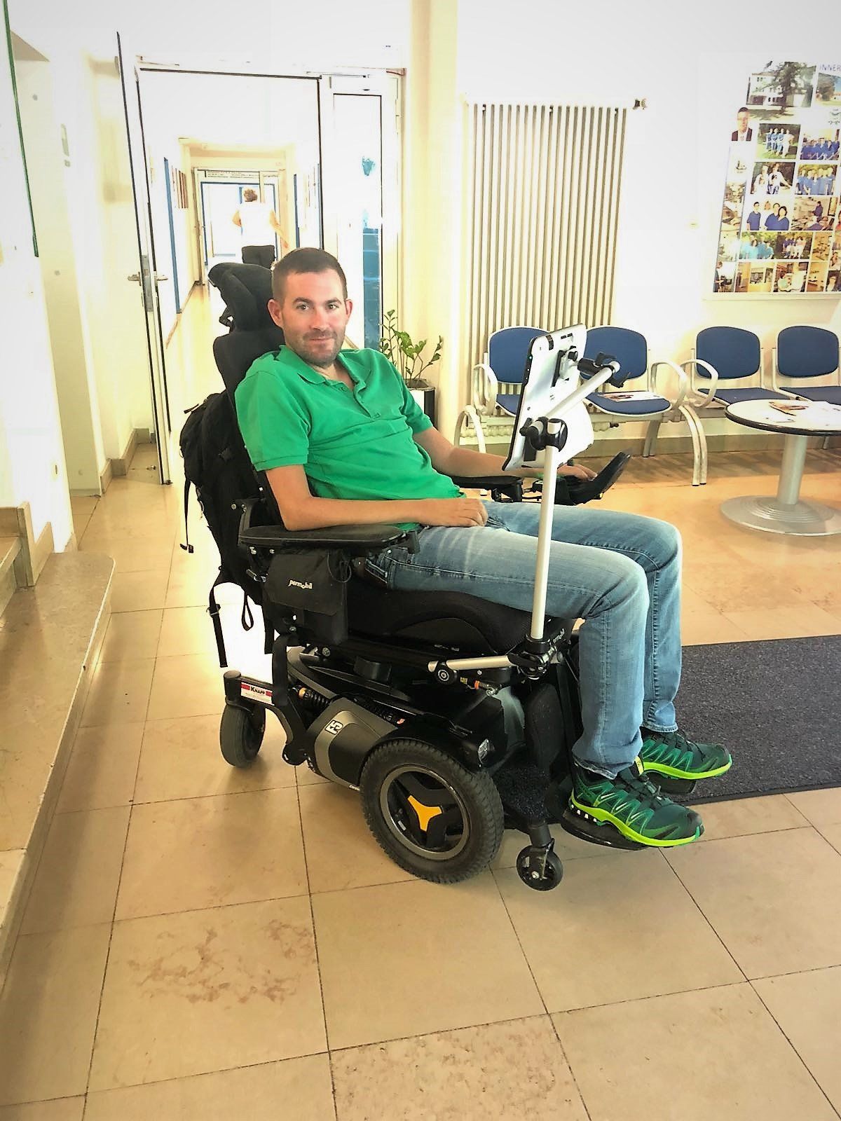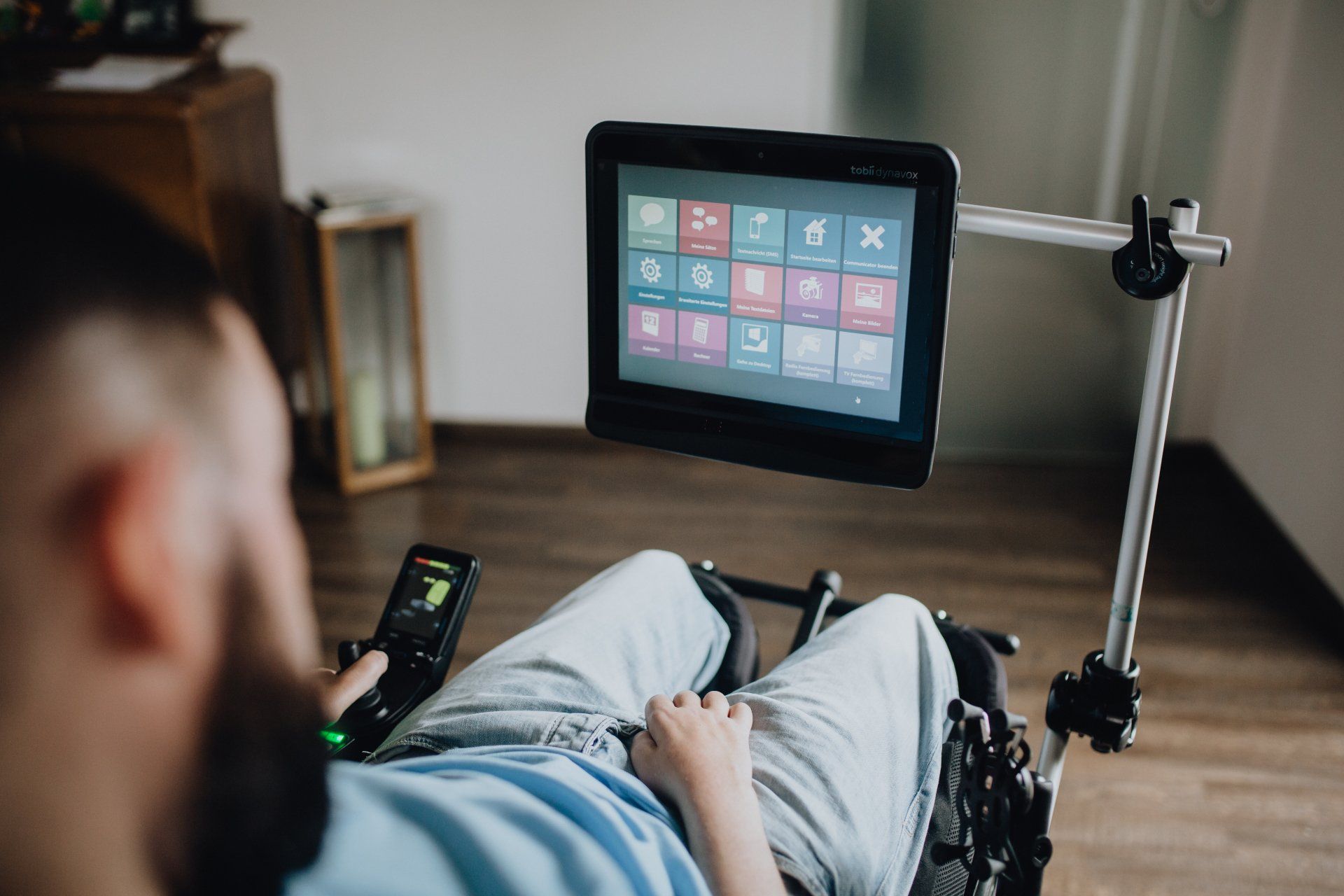 Der Computer scannt meine Augen und erkennt, wohin ich auf dem Bildschirm blicke. Durch spezielle Programme werden mir digitale Werkzeuge, wie zum Beispiel Maus und Tastatur, zur Verfügung gestellt. Eines der Programme liest das geschriebene Wort vor. Somit habe ich wieder eine Stimme. Ich bediene alle Computer im Haus und auf der Arbeit auf diese Weise. Die Basis ist Windows 10. Mein mobiler Computer ist mit einer speziellen Halterung am Rollstuhl und über meinem Pflegebett befestigt.