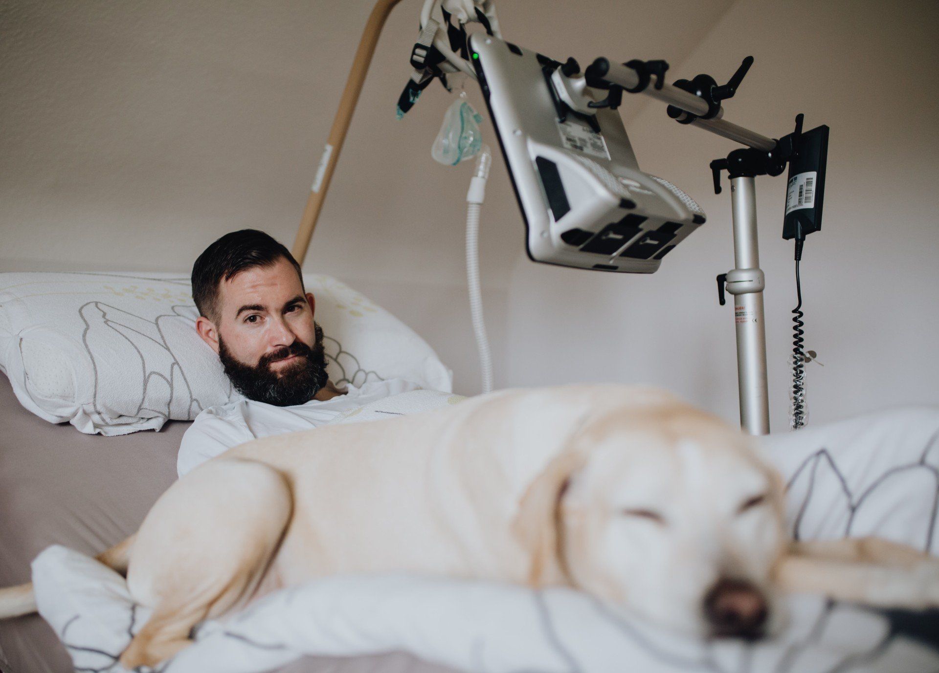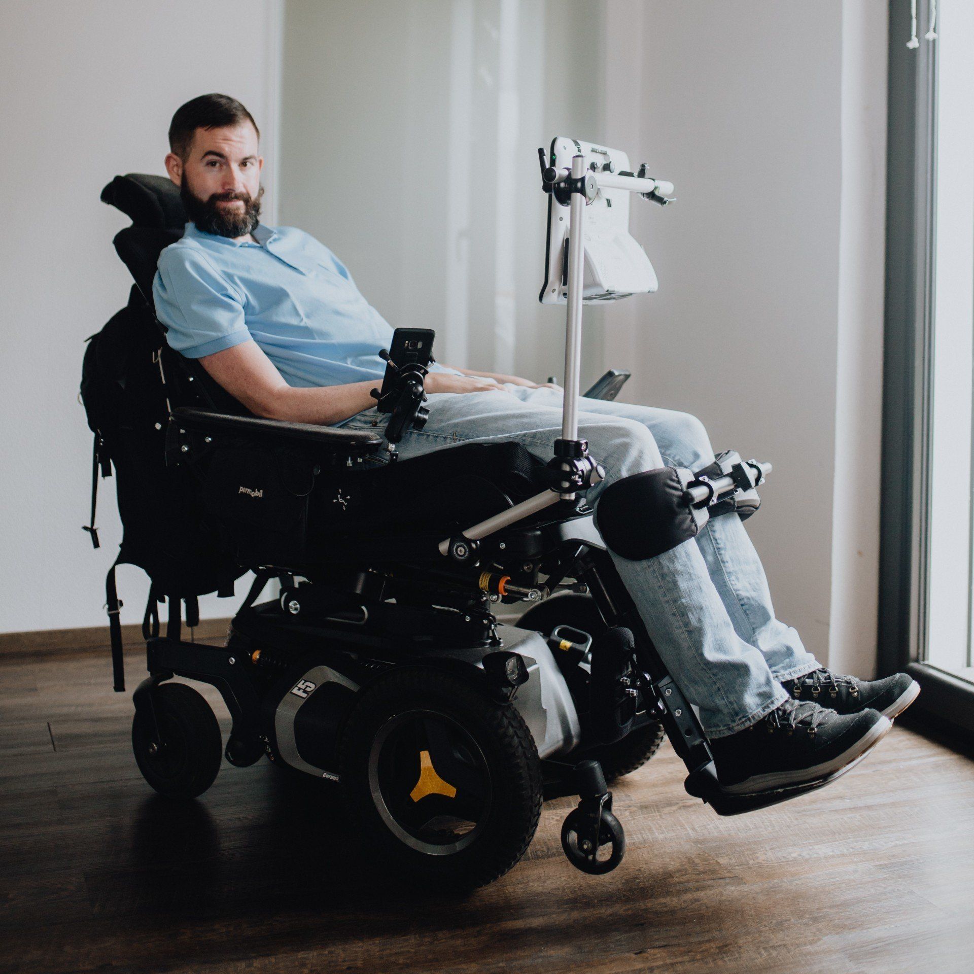 Der Computer scannt meine Augen und erkennt, wohin ich auf dem Bildschirm blicke. Durch spezielle Programme werden mir digitale Werkzeuge, wie zum Beispiel Maus und Tastatur, zur Verfügung gestellt. Eines der Programme liest das geschriebene Wort vor. Somit habe ich wieder eine Stimme. Ich bediene alle Computer im Haus und auf der Arbeit auf diese Weise. Die Basis ist Windows 10. Mein mobiler Computer ist mit einer speziellen Halterung am Rollstuhl und über meinem Pflegebett befestigt.